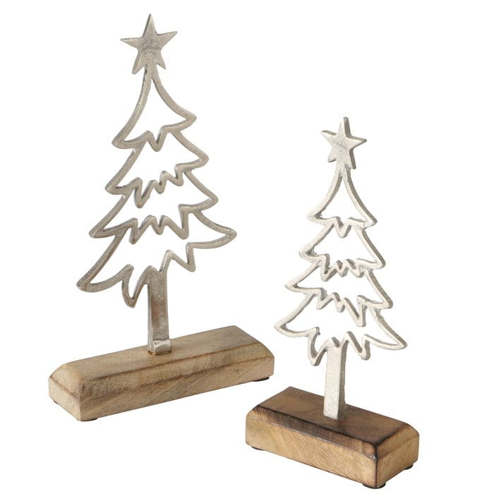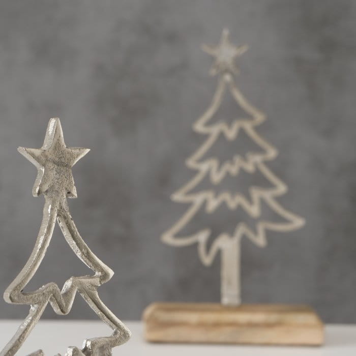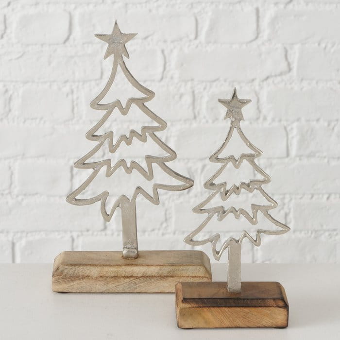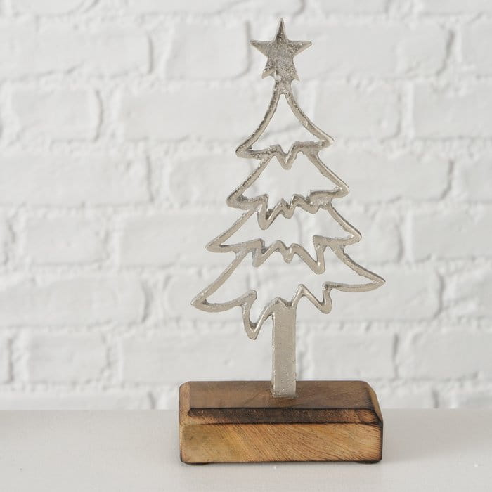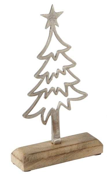 Przedmiotem oferty jest metalowa choinka na drewnianej podstawie.