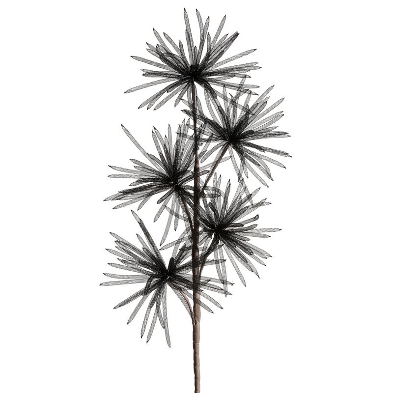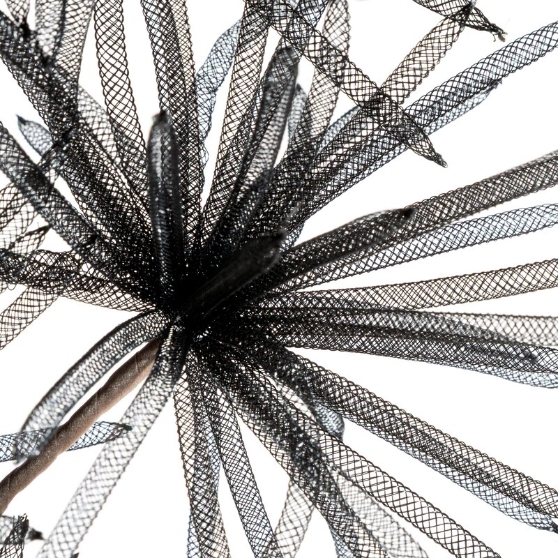 Dekoracyjna gałązka z efektownym kwiatem wykonanym z delikatnej organzy w eleganckim czarnym kolorze. Subtelny połysk materiału oraz staranne wykonanie sprawiają, że ozdoba prezentuje się bardzo stylowo i przyciąga wzrok.