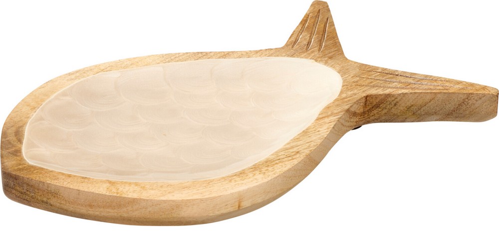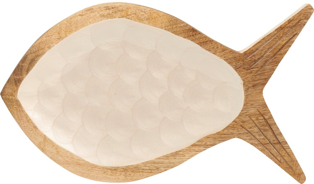 Stylowa patera w kształcie ryby wykonana z naturalnego drewna mango to wyjątkowy element dekoracyjny, który łączy w sobie oryginalny design i funkcjonalność. Jej powierzchnia od góry została wykończona kremową emalią, co nadaje całości eleganckiego, subtelnego charakteru i pięknie kontrastuje z naturalnym rysunkiem drewna.