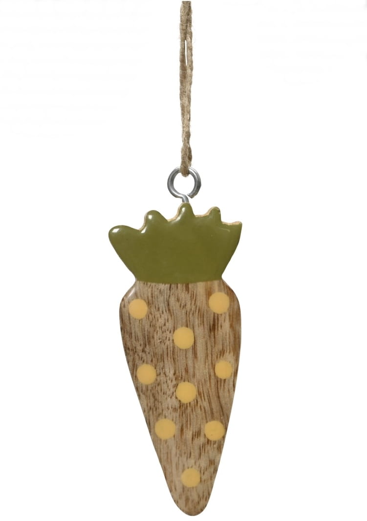 Oryginalna dekoracyjna zawieszka w kształcie marchewki, wykonana z naturalnego drewna mango.