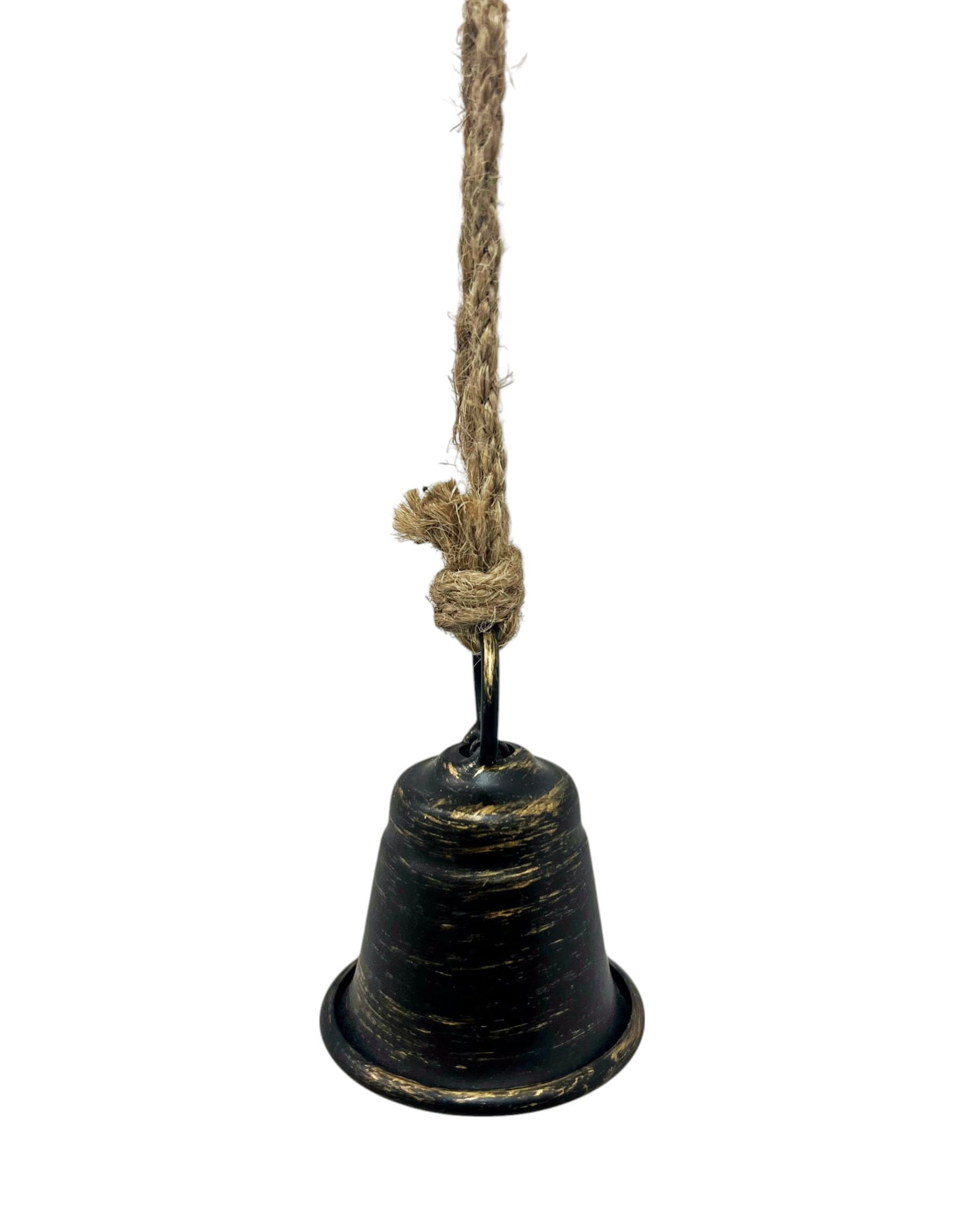 Stylowa i oryginalna zawieszka w kształcie dzwonka, wykonana z metalu w kolorze czarnym z przetarciami złota.