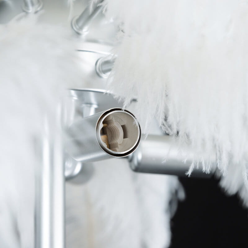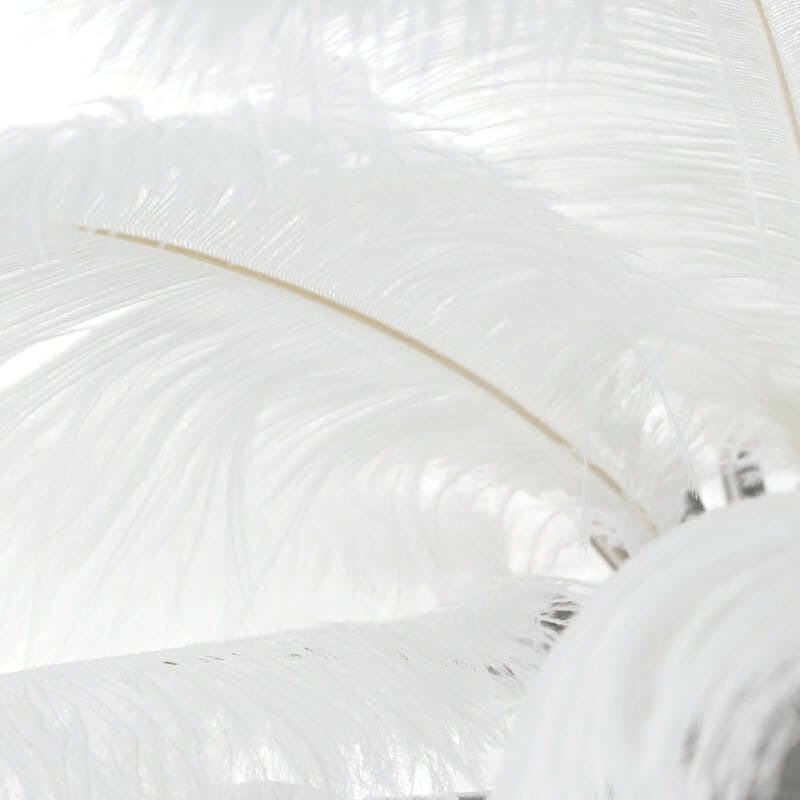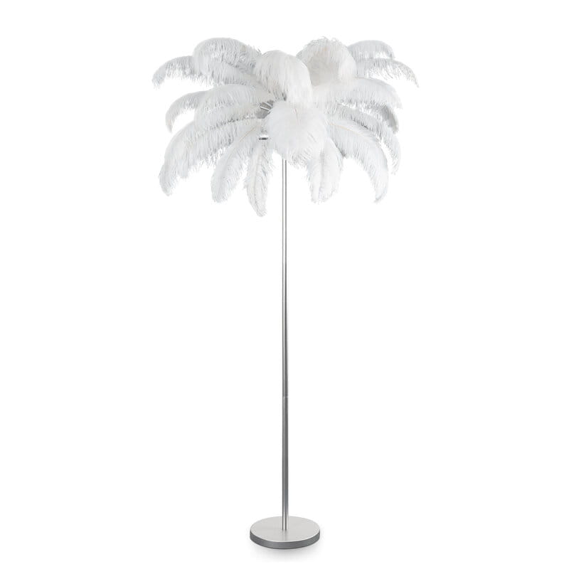 Lampa stojąca FERI zauroczy klientów poszukujących niezwykle efektownych dodatków do dekoracji wnętrz. Swój wyjątkowy charakter zawdzięcza niezwykłemu designowi.Wysmukłą metalową podstawę w kolorze srebrnym nakryto abażurem z naturalnych strusich piór. Pióra nadają wnętrzu efektownego wyglądu, a także tworzą przyjemne efekty świetlne, gdy lampa jest włączona.