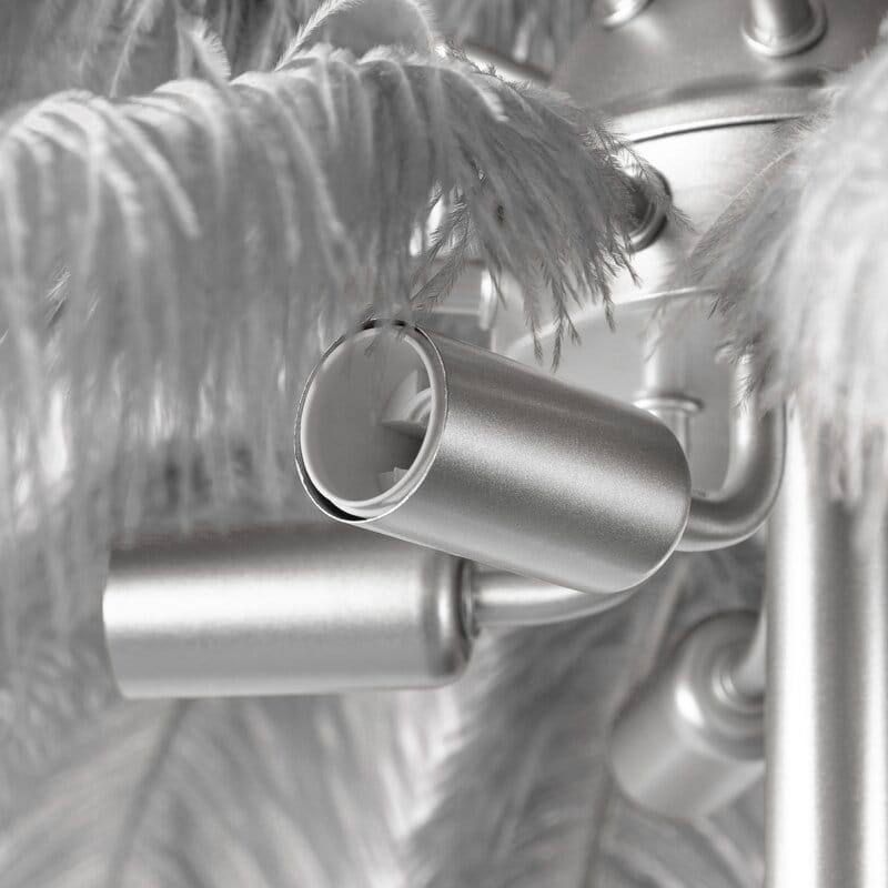 Lampa stojąca FERI zauroczy klientów poszukujących niezwykle efektownych dodatków do dekoracji wnętrz. Swój wyjątkowy charakter zawdzięcza niezwykłemu designowi.Wysmukłą metalową podstawę w kolorze srebrnym nakryto abażurem z naturalnych strusich piór. Pióra nadają wnętrzu efektownego wyglądu, a także tworzą przyjemne efekty świetlne, gdy lampa jest włączona.