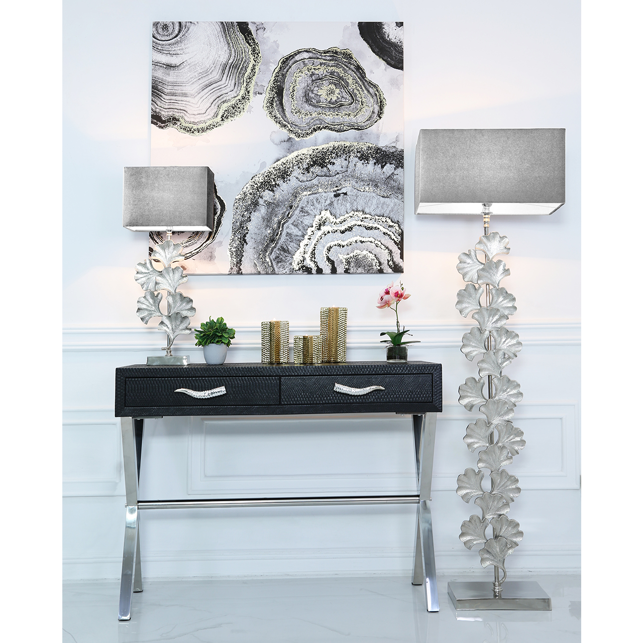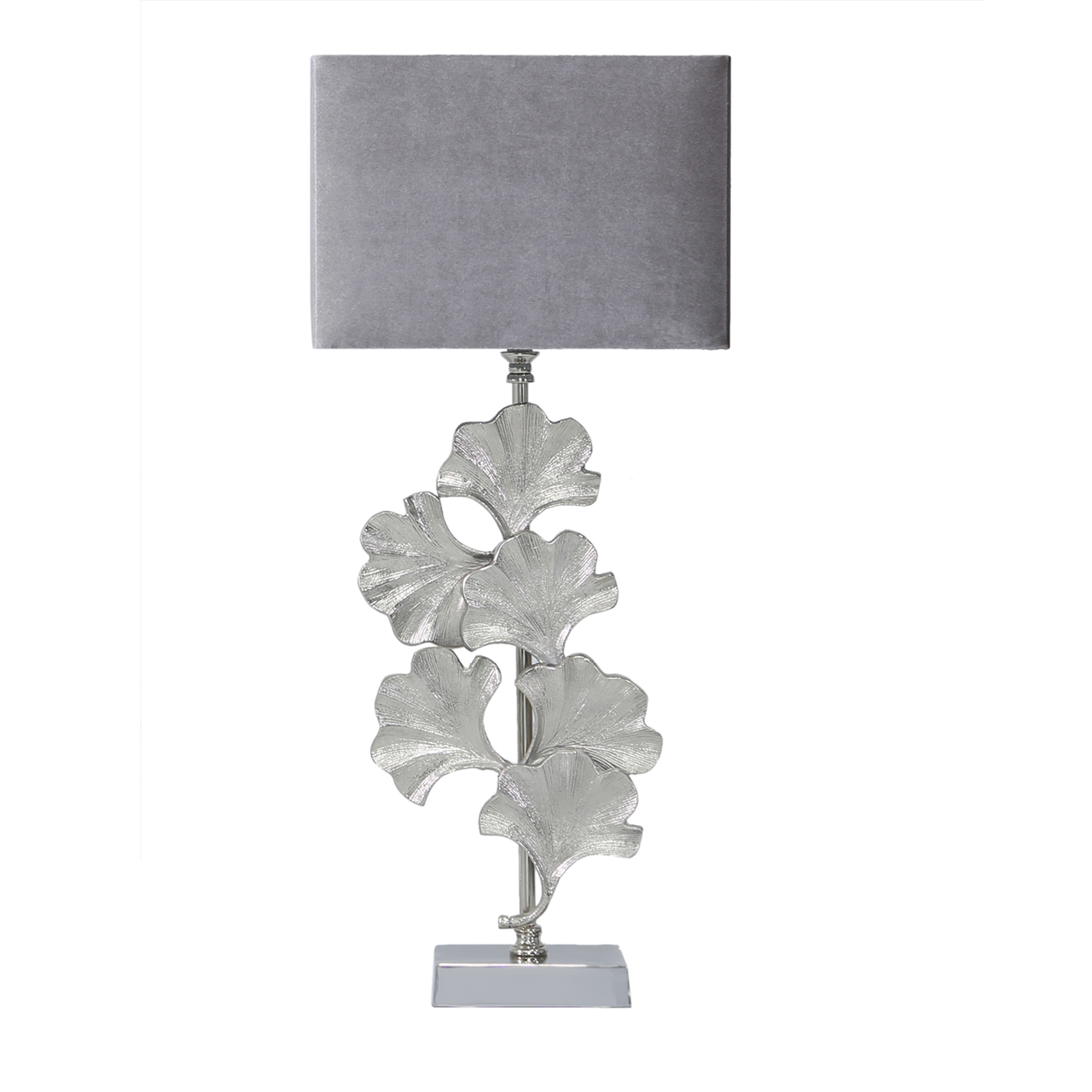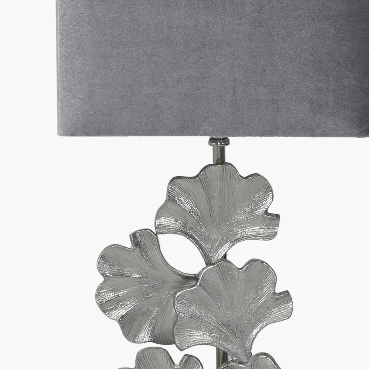 Noga lampy wykonana jest z aluminium ozdobionym wzorem z kwiatów miłorzębu.