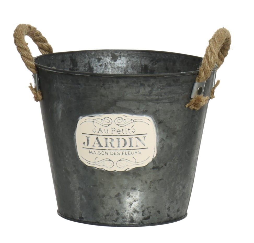Przedmiotem aukcji jest dekoracyjna osłonka na kwiaty wykonana z metalu, wyposażona w dwa solidne uchwyty z naturalnej juty. To wyjątkowe połączenie surowego metalu i naturalnego sznura nadaje całości modnego, rustykalnego charakteru.