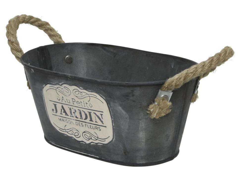 Przedmiotem aukcji jest dekoracyjna osłonka na kwiaty wykonana z metalu, wyposażona w dwa solidne uchwyty z naturalnej juty. To wyjątkowe połączenie surowego metalu i naturalnego sznura nadaje całości modnego, rustykalnego charakteru.