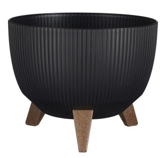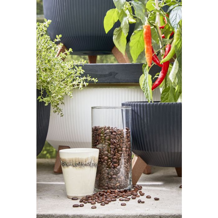 Trzy brązowe nogi wykonane są w 40% z drewna pochodzącego z recyklingu, posiadającego certyfikat FSC® i w 60% z polipropylenu. Doniczka jest również lekka oraz odporna na promieniowanie UV i mróz. Wyjmowany korek tworzy otwór drenażowy, zapewniając odpowiedni drenaż doniczki. Dzięki temu doniczka nadaje się zarówno do użytku wewnątrz, jak i na zewnątrz. Idealnie komponuje się z kolorową rośliną.