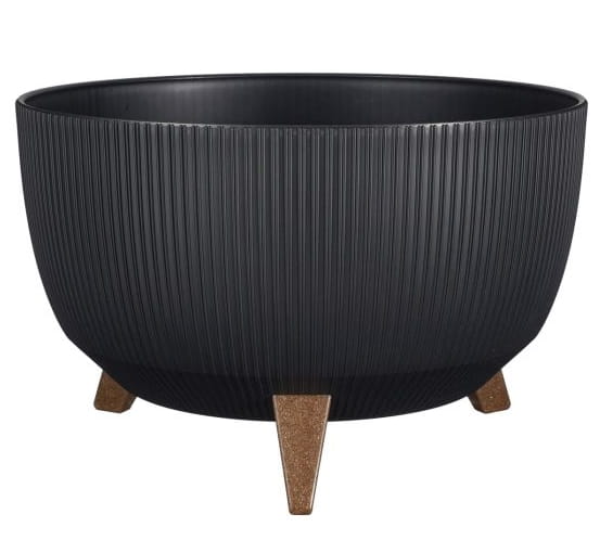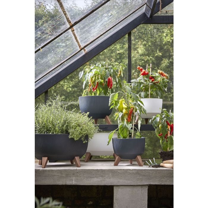 Trzy brązowe nogi wykonane są w 40% z drewna pochodzącego z recyklingu, posiadającego certyfikat FSC® i w 60% z polipropylenu. Doniczka jest również lekka oraz odporna na promieniowanie UV i mróz. Wyjmowany korek tworzy otwór drenażowy, zapewniając odpowiedni drenaż doniczki. Dzięki temu doniczka nadaje się zarówno do użytku wewnątrz, jak i na zewnątrz. Idealnie komponuje się z kolorową rośliną.