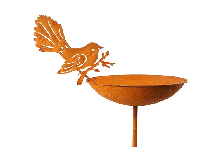 Okrągła misa została wykończona efektem rdzy, który nadaje całości rustykalnego, lekko vintage charakteru i doskonale komponuje się z zielenią roślin. Na rancie poidełka znajduje się ozdobny ptaszek, dodający uroku i przyciągający skrzydlatych gości.