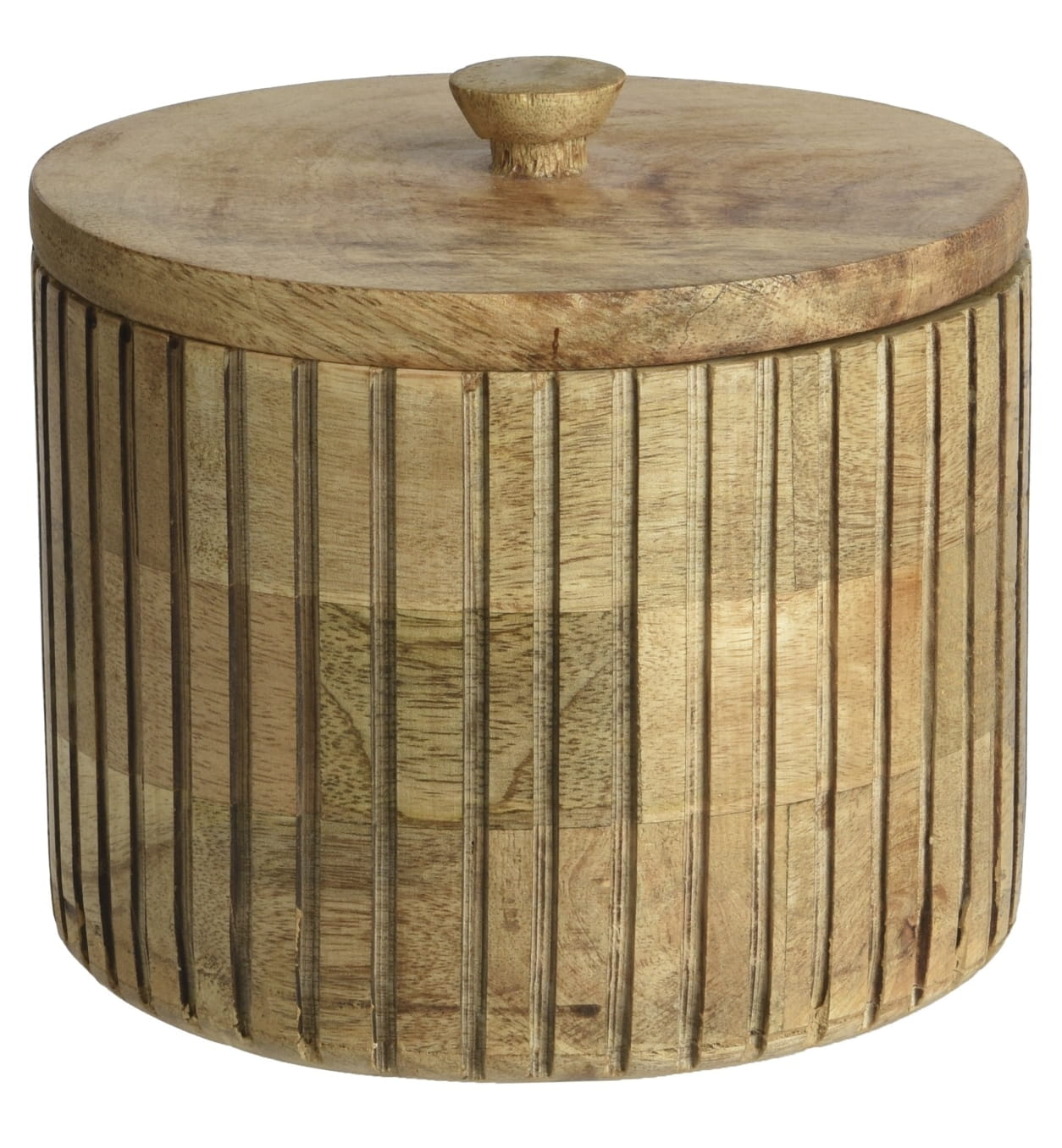Stylowy okrągły pojemnik wykonany z naturalnego drewna mango z dopasowaną przykrywką, który łączy funkcjonalność z eleganckim, naturalnym wyglądem.