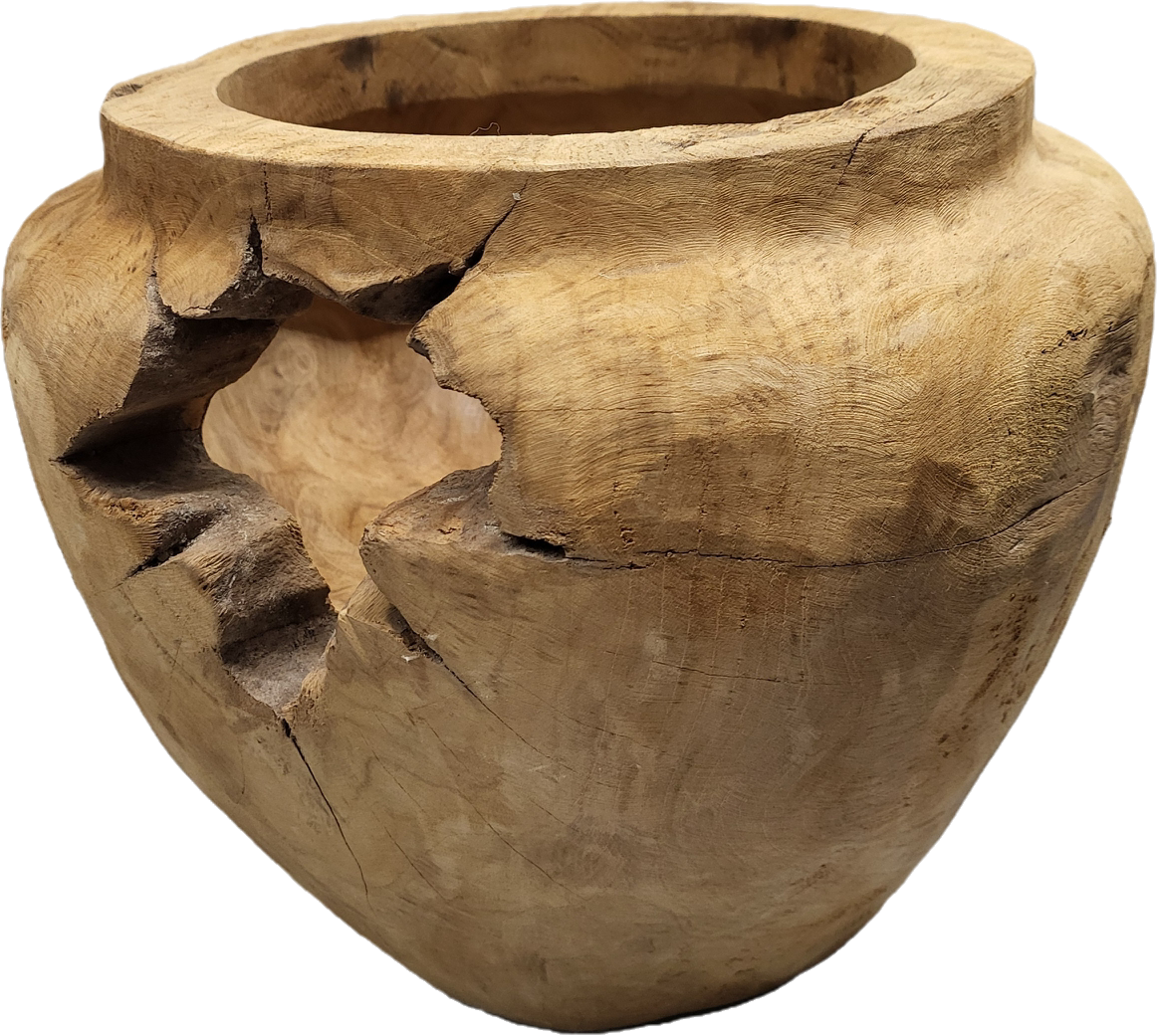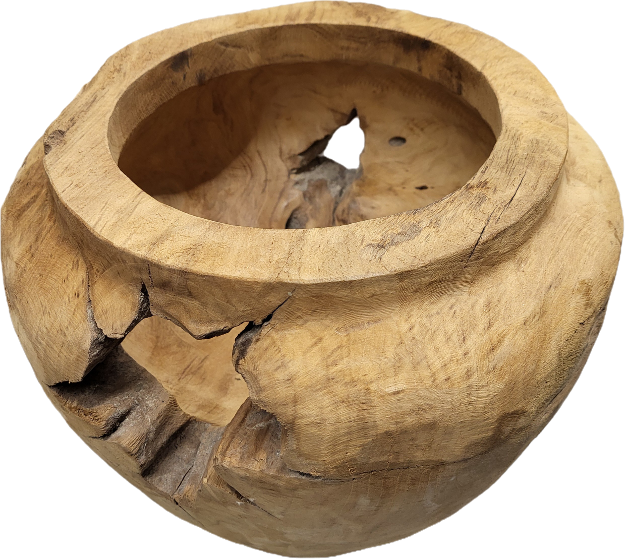 Przedmiotem aukcji jest dekoracyjna osłonka na donicę, wykonana ręcznie z litego drewna teakowego.