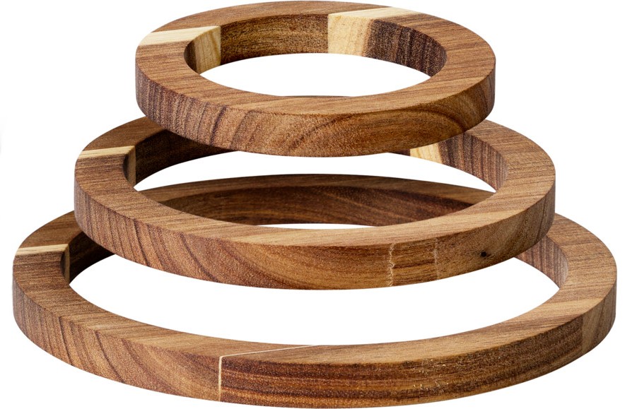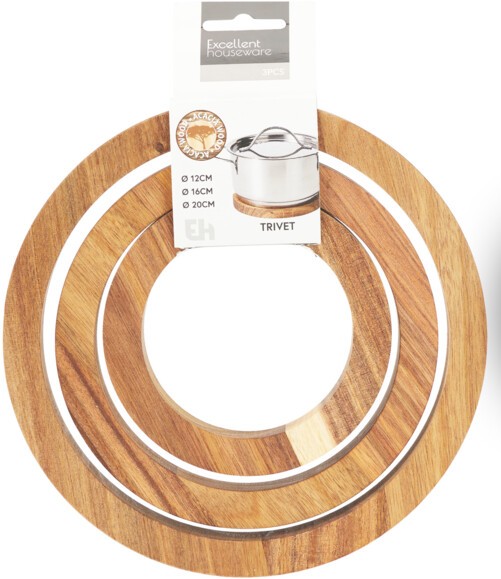 Zestaw trzech solidnych i eleganckich podkładek pod garnek wykonanych z naturalnego drewna akacjowego. Okrągły kształt oraz klasyczny design sprawiają, że doskonale pasują do każdej kuchni – zarówno nowoczesnej, jak i tradycyjnej.