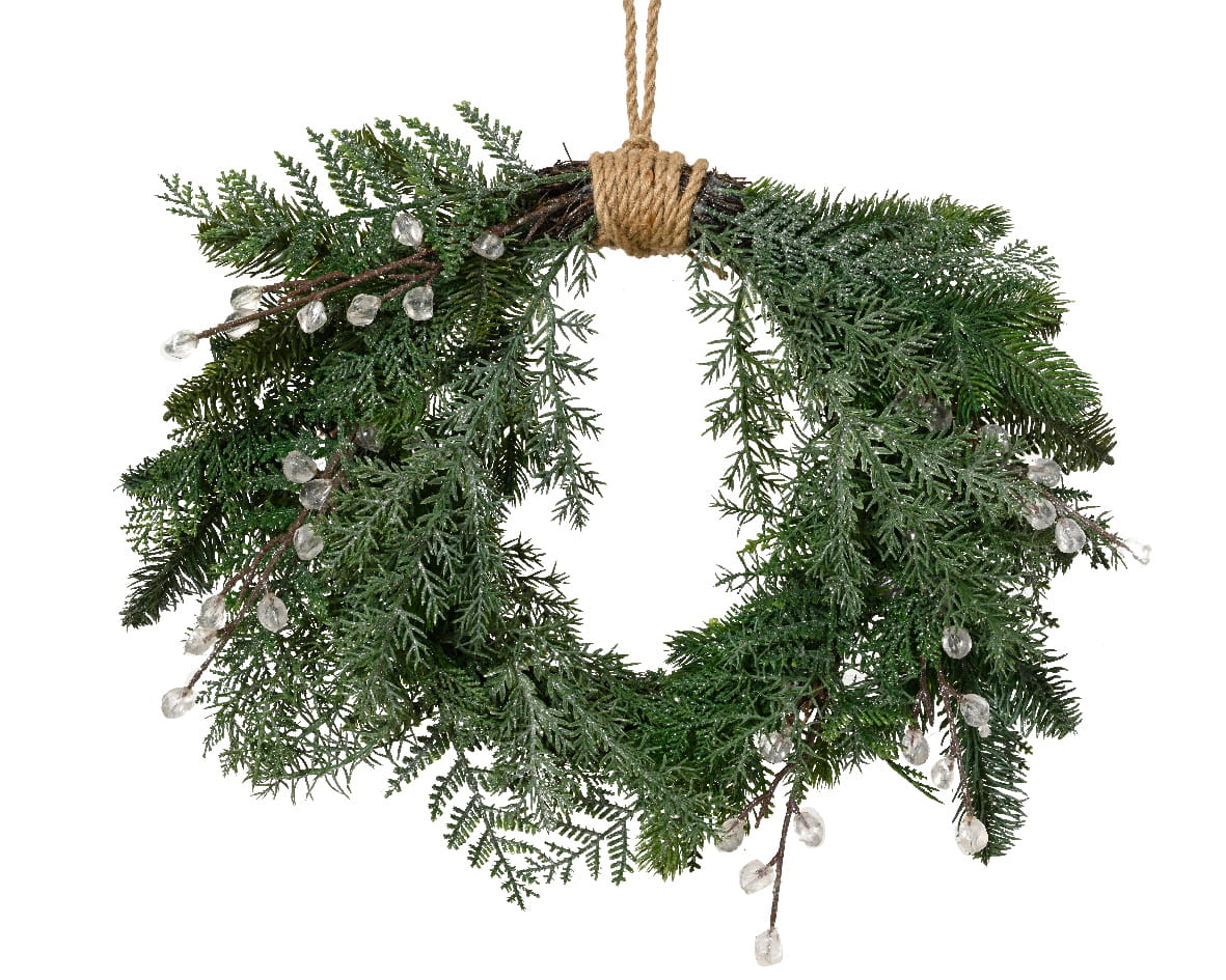 Wyjątkowy świąteczny wianek dekoracyjny, wykonany z gałązek imitujących choinkę, delikatnie oprószony sztucznym śniegiem i ozdobiony dekoracyjnymi kostkami lodu. Całość utrzymana jest w chłodnej, zimowej tonacji, a naturalny uchwyt ze sznura jutowego dodaje mu rustykalnego uroku.