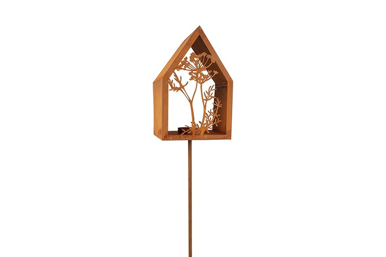 Urokliwy świecznik ogrodowy w kształcie ażurowego domku, przeznaczony do wbicia w ziemię. Wykonany z metalu z efektem rdzy, łączy funkcjonalność z rustykalnym, naturalnym designem, który wprowadza przytulny klimat do ogrodu, na taras czy balkon.