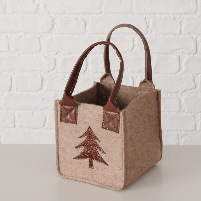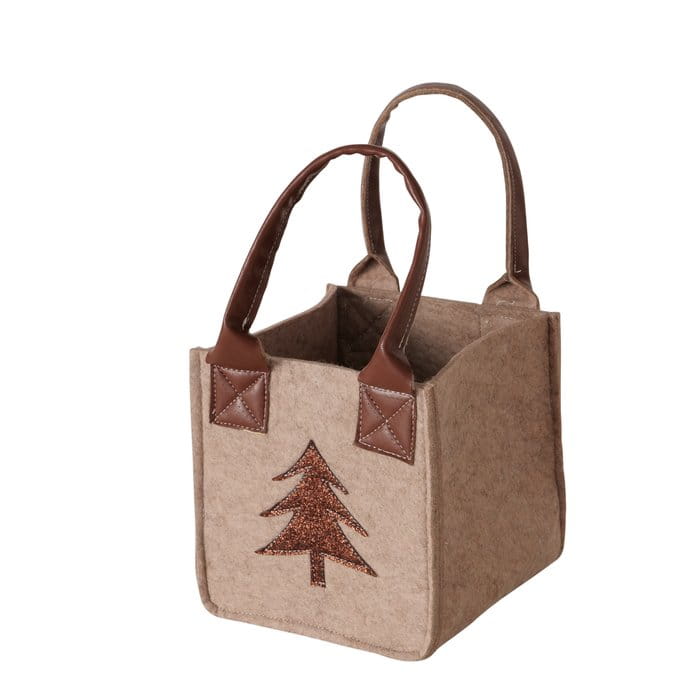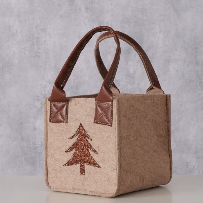 Stylowa i ekologiczna torebka prezentowa wykonana z miękkiego, beżowego filcu, ozdobiona uroczą aplikacją choinki.