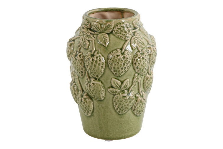 Oryginalny wazon dekoracyjny wykonany z ceramiki to wyjątkowy dodatek, który przyciąga wzrok i nadaje wnętrzu świeżości. Jego powierzchnia została ozdobiona efektowną aplikacją z wypukłymi truskawkami, co nadaje mu unikalnego, lekko artystycznego charakteru.