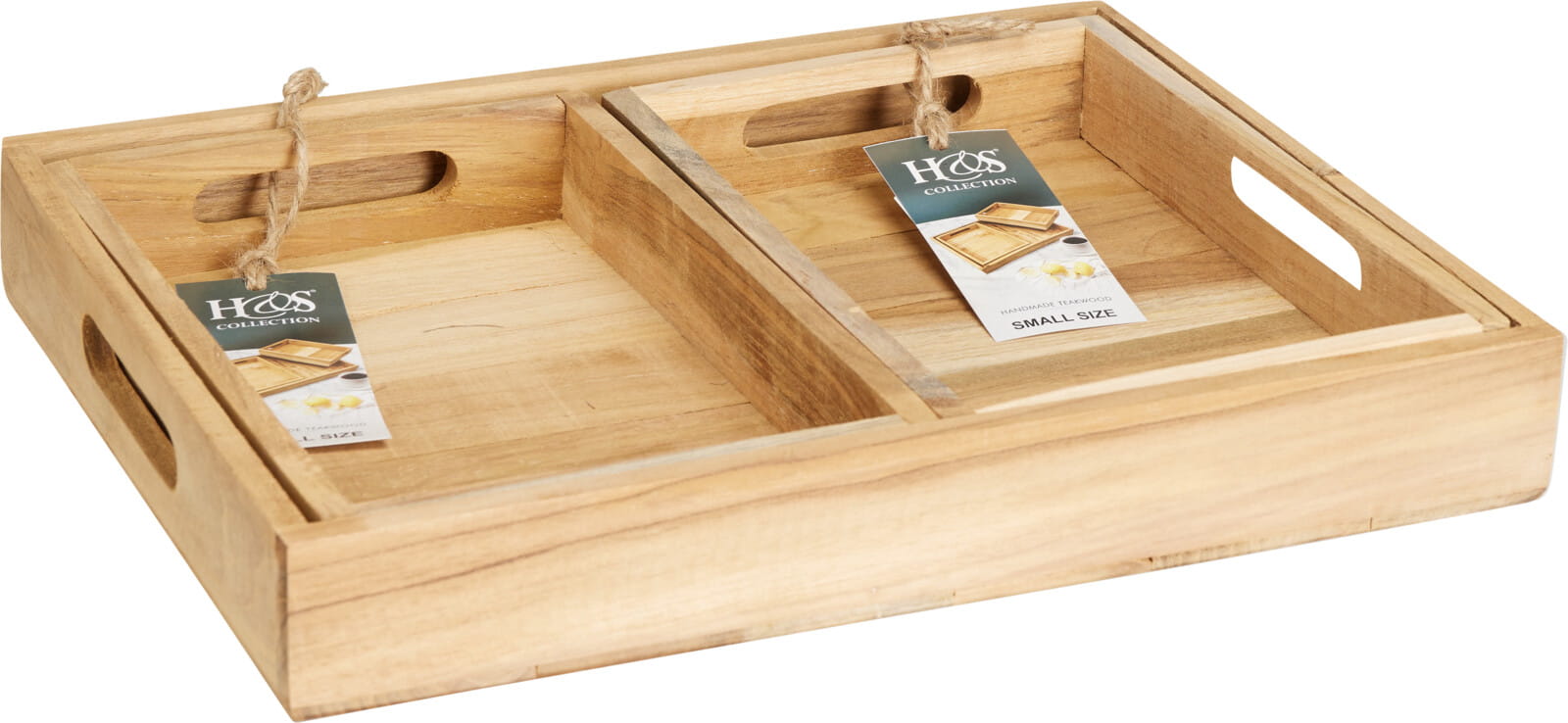 Zestaw obejmuje jedną większą tacę oraz dwie mniejsze, które można przechowywać jedna w drugiej, co pozwala zaoszczędzić miejsce. Solidne wykonanie z płyty MDF zapewnia trwałość i stabilność podczas przenoszenia napojów, przekąsek czy dekoracji.